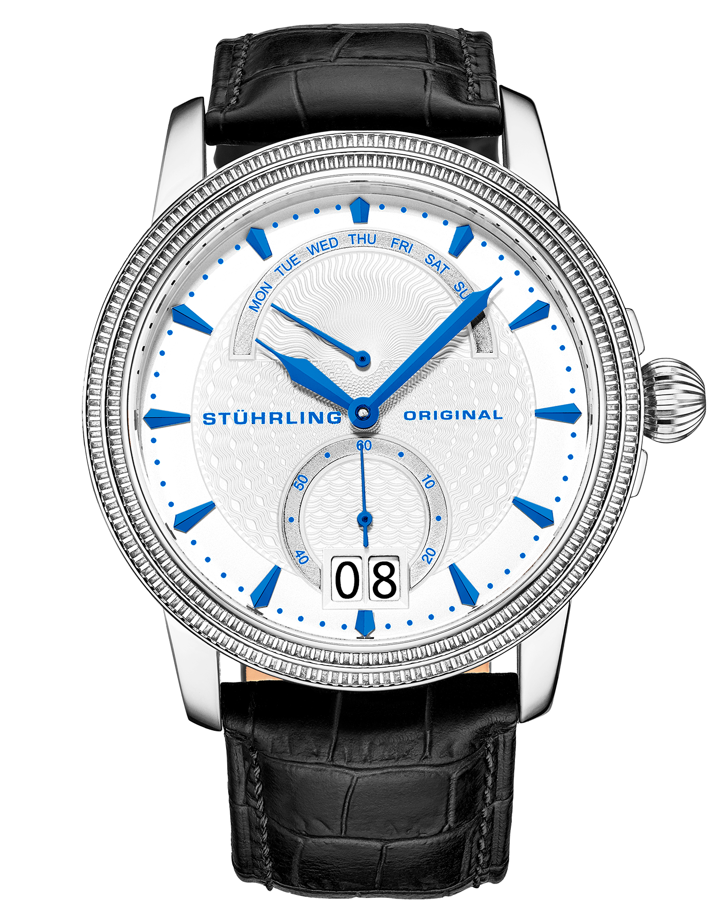 The intricately textured dial is accented by bold blue hands and markers, offering exceptional readability while delivering a sophisticated aesthetic that reflects classic European watch design.
