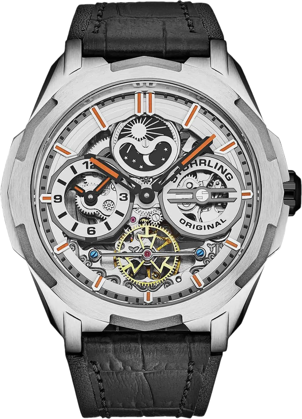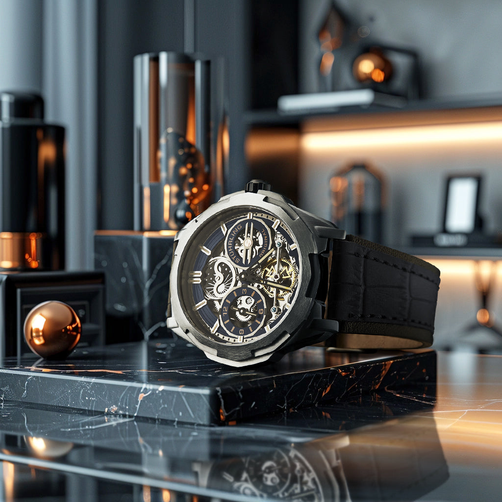 The bold 46mm stainless-steel case delivers a commanding presence on the wrist while protecting the intricate mechanics within. Precision-finished surfaces and sculpted edges create a design that feels both modern and enduring.