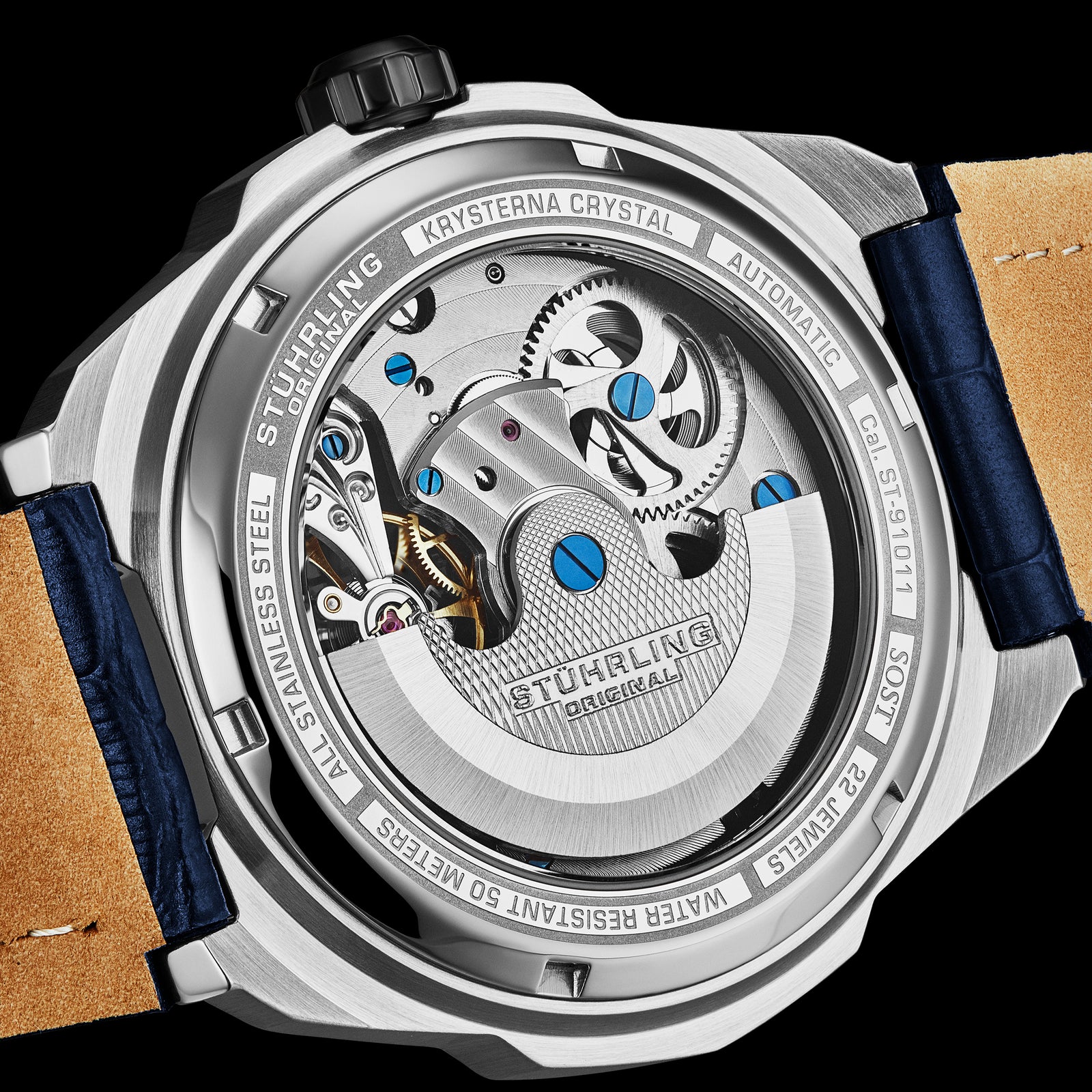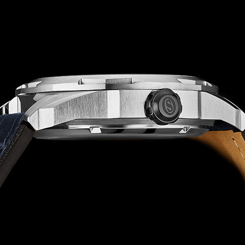 Encased in solid stainless steel and finished with an exhibition caseback, the Navigator reveals the intricate beauty of its 22-jewel movement—paired with a supple leather strap for enduring comfort and style.